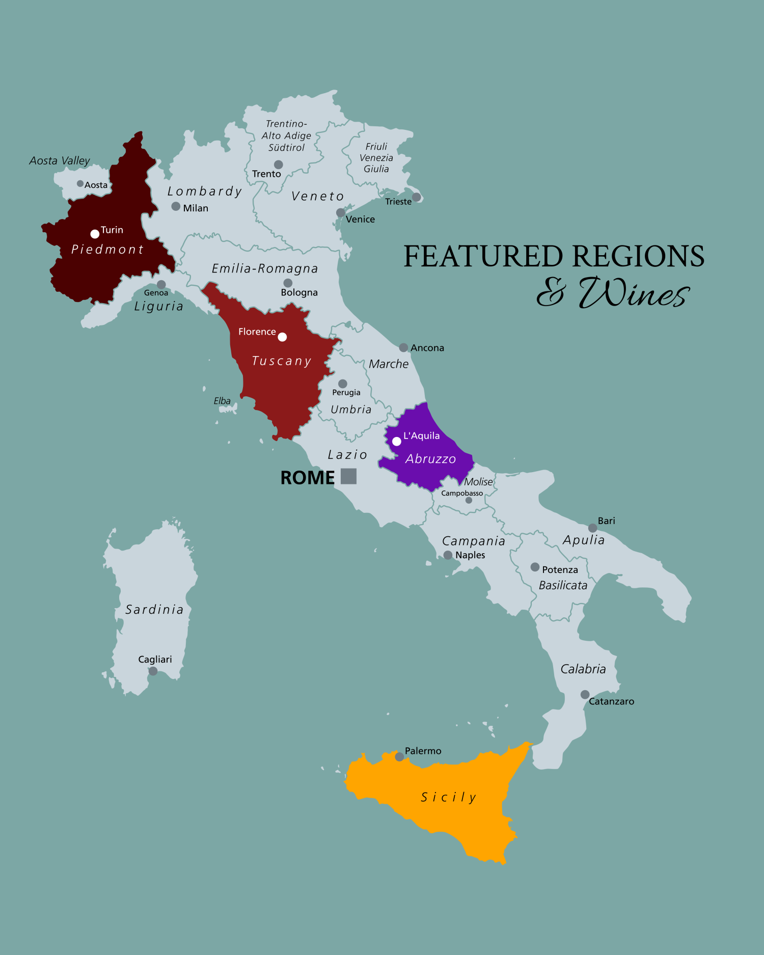 SicilyKnown for bold reds and refreshing whites.Highlight: Nero d’Avola (rich, full-bodied with dark fruit flavors) and Pinot GrigioTuscanyThe heart of Sangiovese and iconic Chianti Classico.Highlight: Brunello di Montalcino and ChardonnayPiedmonteLegendary reds with structure and elegance.Highlight: Barolo (the “King of Wines”), Barbaresco, plus whites like GaviAbruzzoUnderrated gem producing approachable yet complex wines.Highlight: Montepulciano d’Abruzzo (medium to full-bodied, notes of plum and spice) and PecorinoExplore our curated Italian selection and bring the vineyards of Sicily, Tuscany, Piedmonte, and Abruzzo to your table.