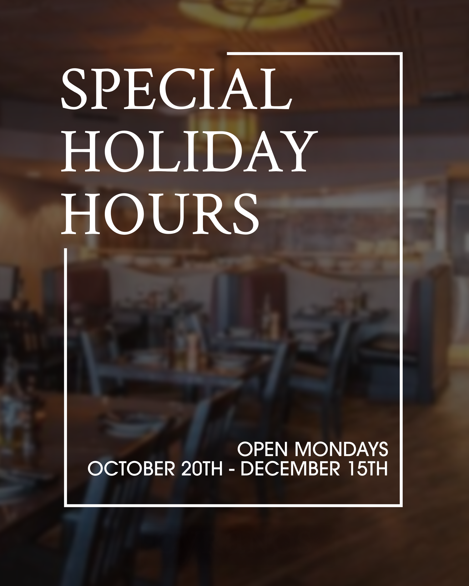 To help you make the most of the busy holiday season, we’re excited to announce that we will be open on Mondays throughout the holiday period!Whether you’re planning festive gatherings, holiday lunches, or celebrating with loved ones, we’re here to make your season a little easier.Holiday Monday Hours:Open Mondays from October 20th through December 15thLunch: 11:30 to 2:30Dinner: 4:30 to 9:30
